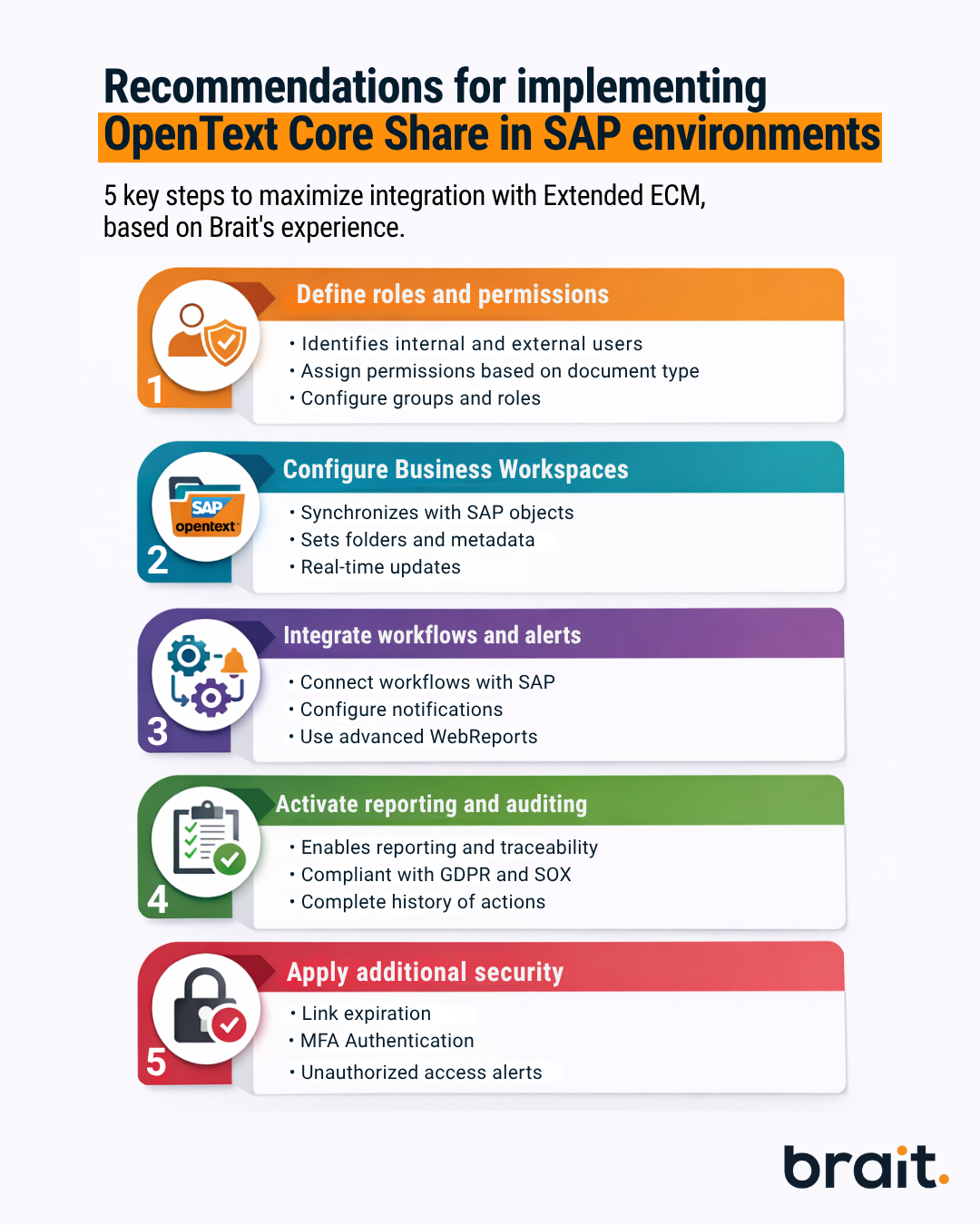 To maximize the integration of Core Share and Extended ECM of OpenText in SAP environments Some of the best practices based on our experience at Brait are: